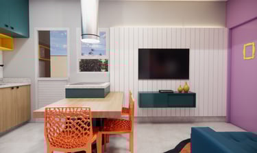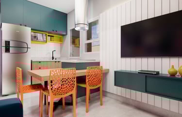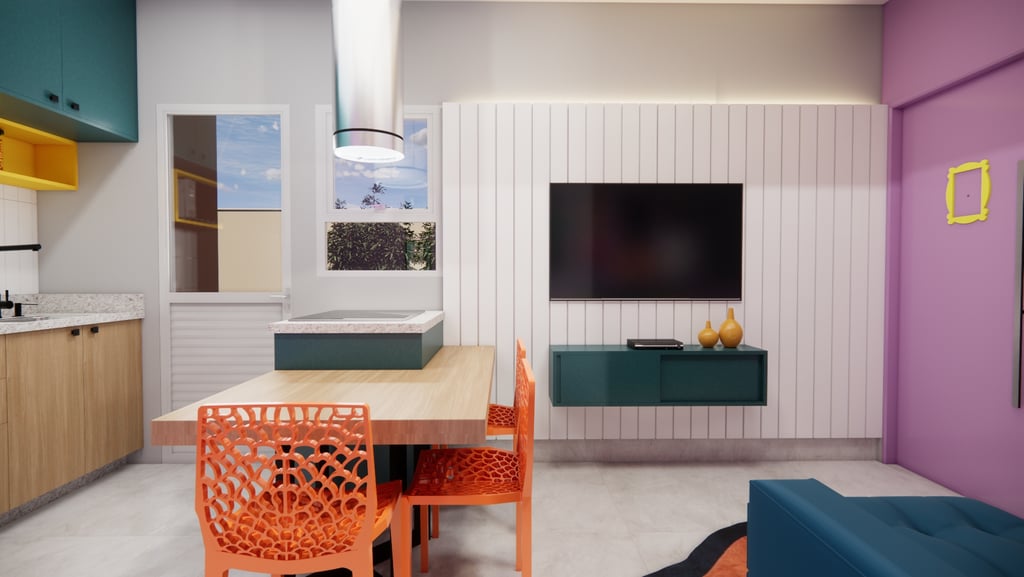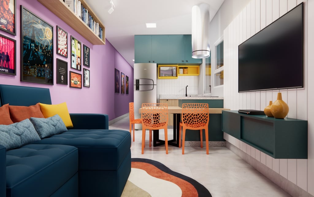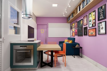 Esse projeto de interiores é um exemplo perfeito de como é possível criar um ambiente que reflita a personalidade e os gostos do cliente. Com a combinação certa de elementos, como livros, quadros e cores vibrantes, é possível transformar uma sala e cozinha em espaços cheios de vida e personalidade.
