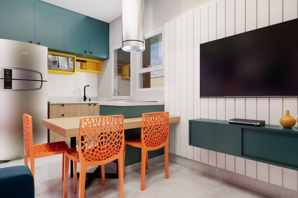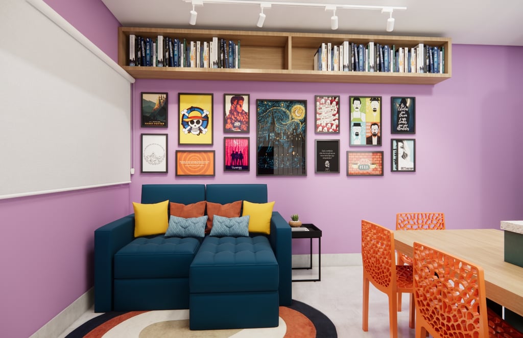 Para criar uma atmosfera jovial e vibrante, as cores desempenham um papel fundamental nesse projeto. Tons alegres e vivos foram utilizados nas paredes, móveis e acessórios, trazendo energia e tornando esses espaços ainda mais convidativos e agradáveis.